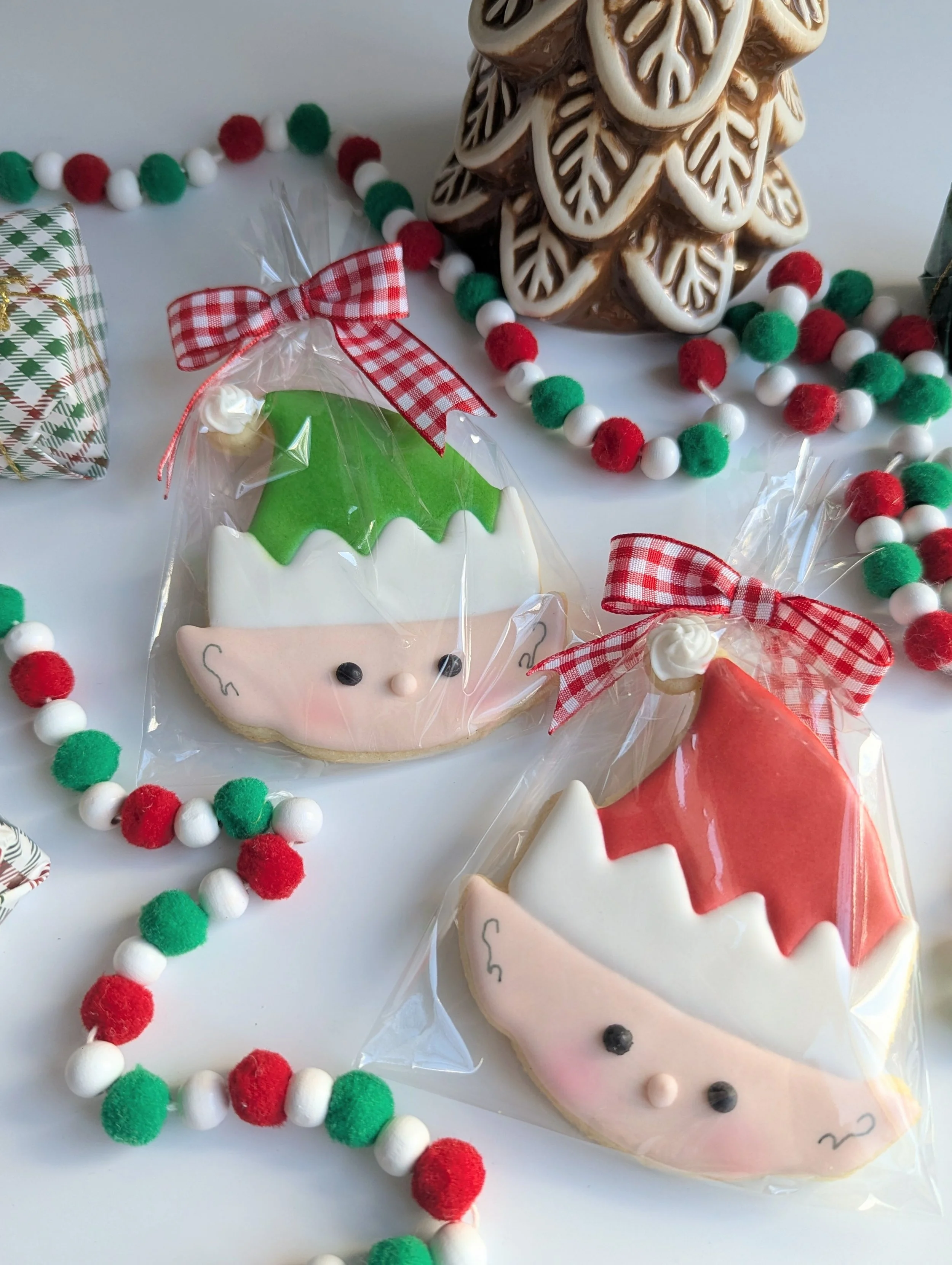 Each cookie is a vanilla bean sugar cookie with vanilla royal icing. Choose from green or red hat color. Add personalization at checkout. All cookies come individually heat sealed with a bow and stay fresh for up to 2 weeks at room temp, or can be frozen.